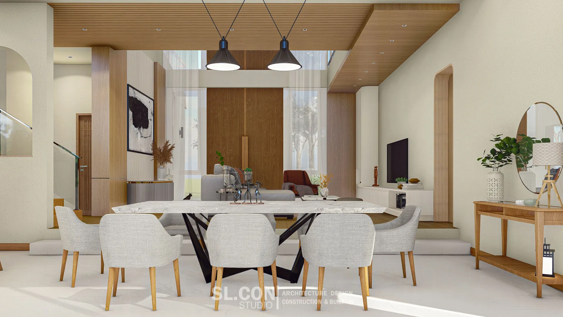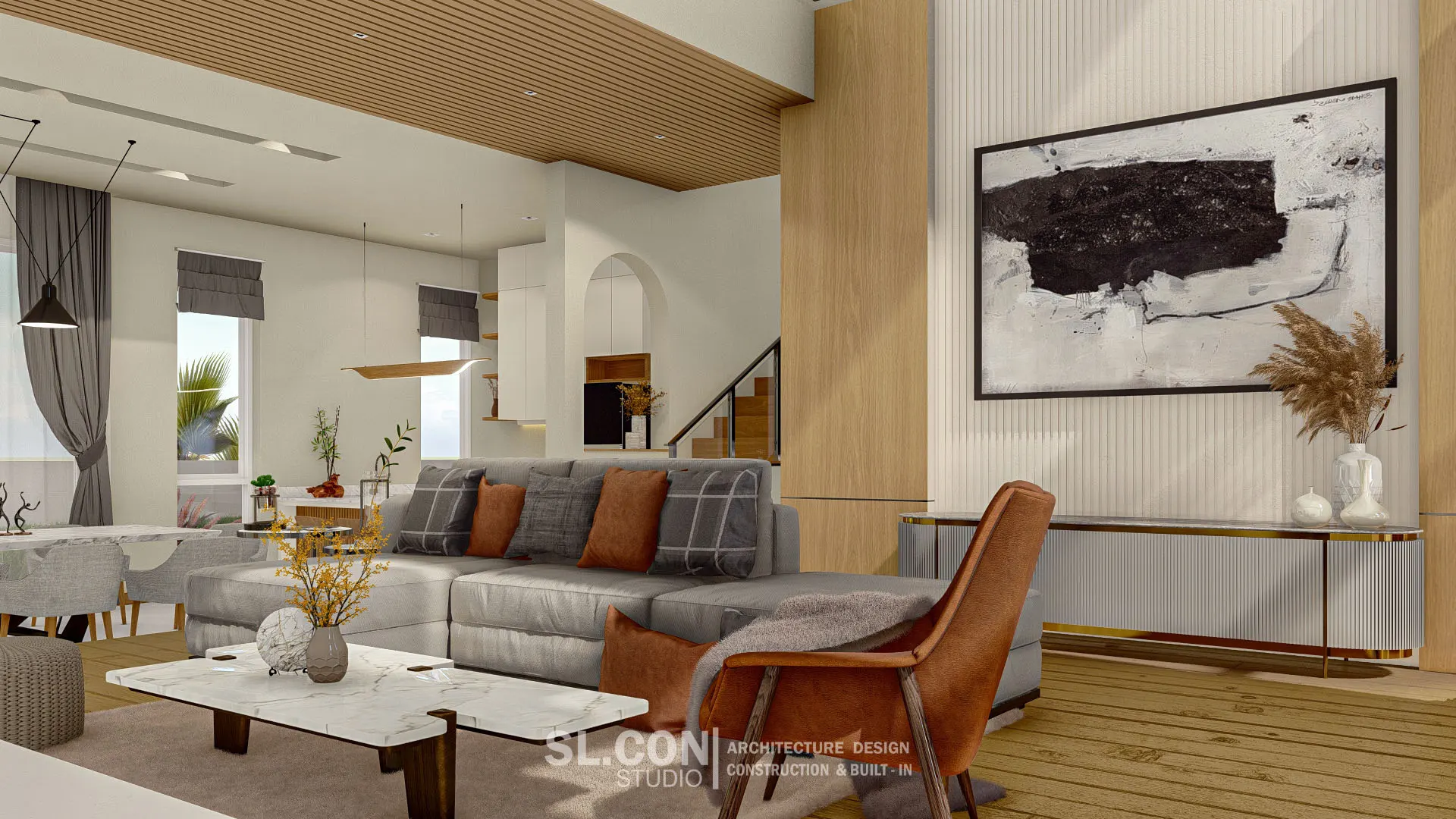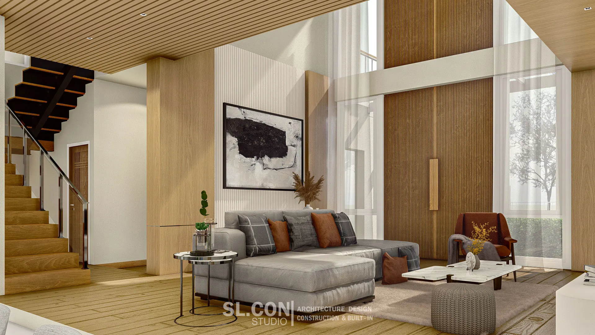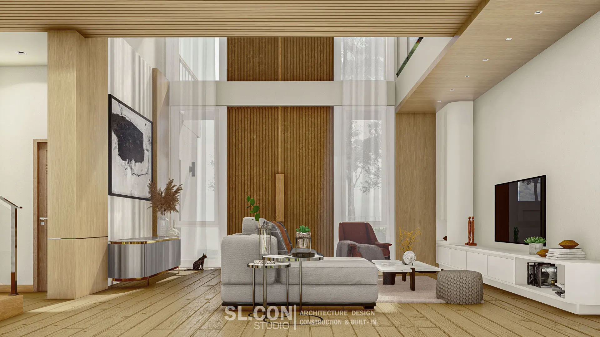 บ้าน Modern Contemporary จ.เชียงใหม่ การผสมผสานความเรียบง่ายแบบตะวันออกเข้ากับความหรูหราทันสมัย ห้องนั่งเล่นแบบ Double Volume ที่เปิดฝ้าเพดานสูงเชื่อมต่อชั้น 1 และชั้น 2 ช่วยให้บ้านดูโปร่งโล่ง อากาศถ่ายเทได้ดี และให้ความรู้สึกโอ่อ่าเหมือนโรงแรมระดับ 5 ดาว ตกแต่งผนังสูงด้วยงานไม้เพิ่มความหรูหราและอบอุ่นในคราวเดียวกัน
