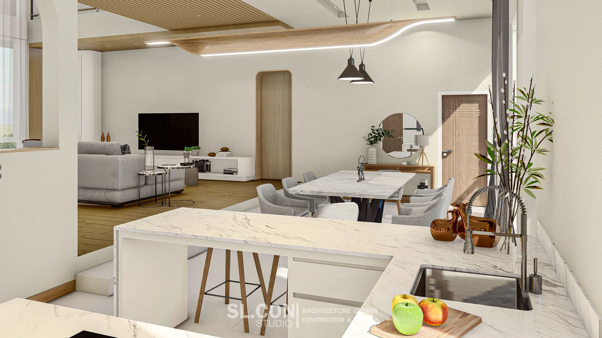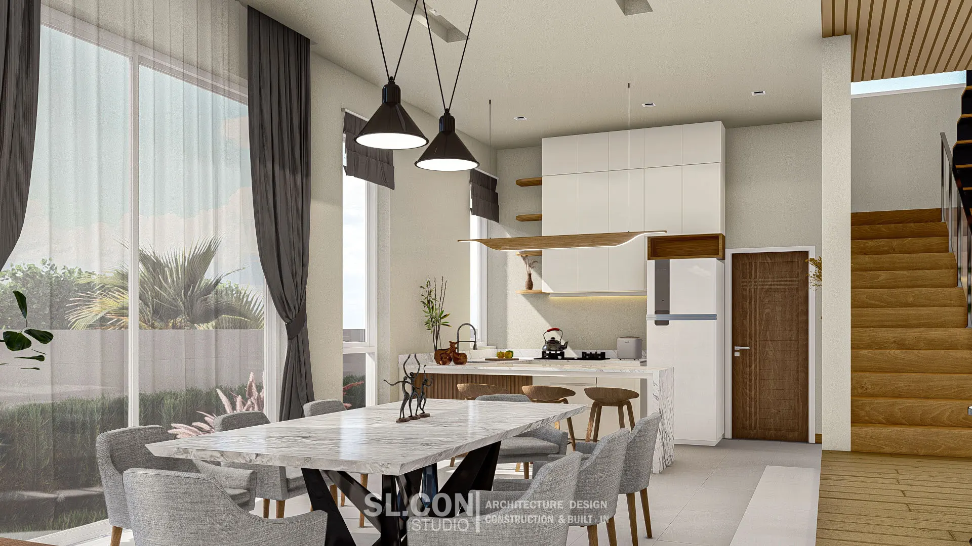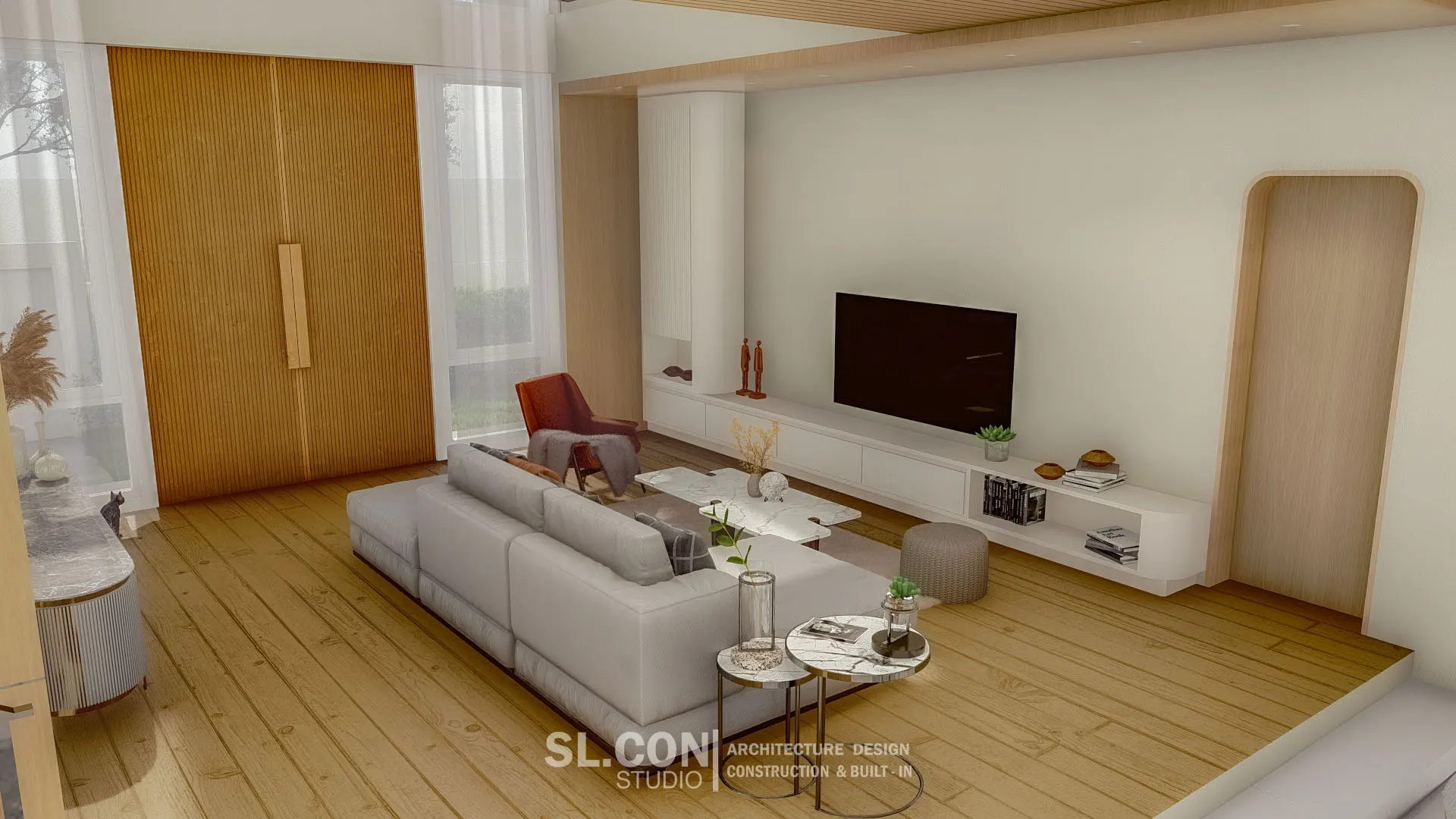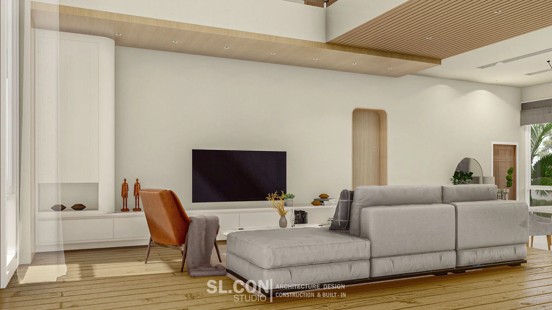บ้าน Modern Contemporary จ.เชียงใหม่ การผสมผสานความเรียบง่ายแบบตะวันออกเข้ากับความหรูหราทันสมัย ห้องนั่งเล่นแบบ Double Volume ที่เปิดฝ้าเพดานสูงเชื่อมต่อชั้น 1 และชั้น 2 ช่วยให้บ้านดูโปร่งโล่ง อากาศถ่ายเทได้ดี และให้ความรู้สึกโอ่อ่าเหมือนโรงแรมระดับ 5 ดาว ตกแต่งผนังสูงด้วยงานไม้เพิ่มความหรูหราและอบอุ่นในคราวเดียวกัน