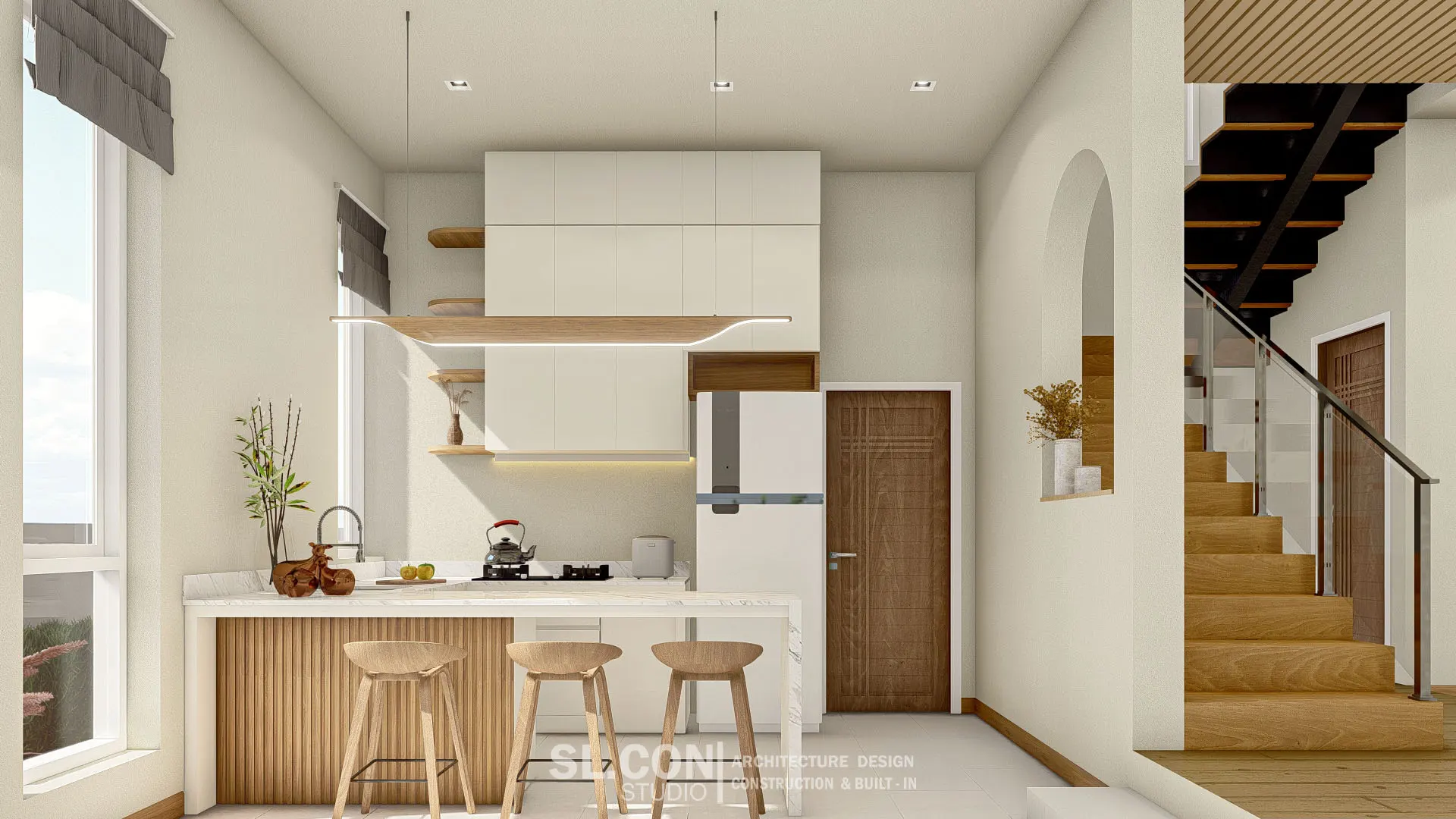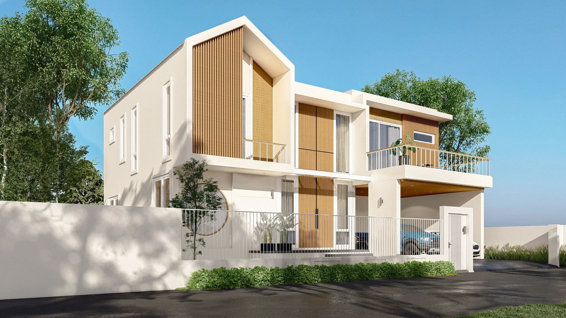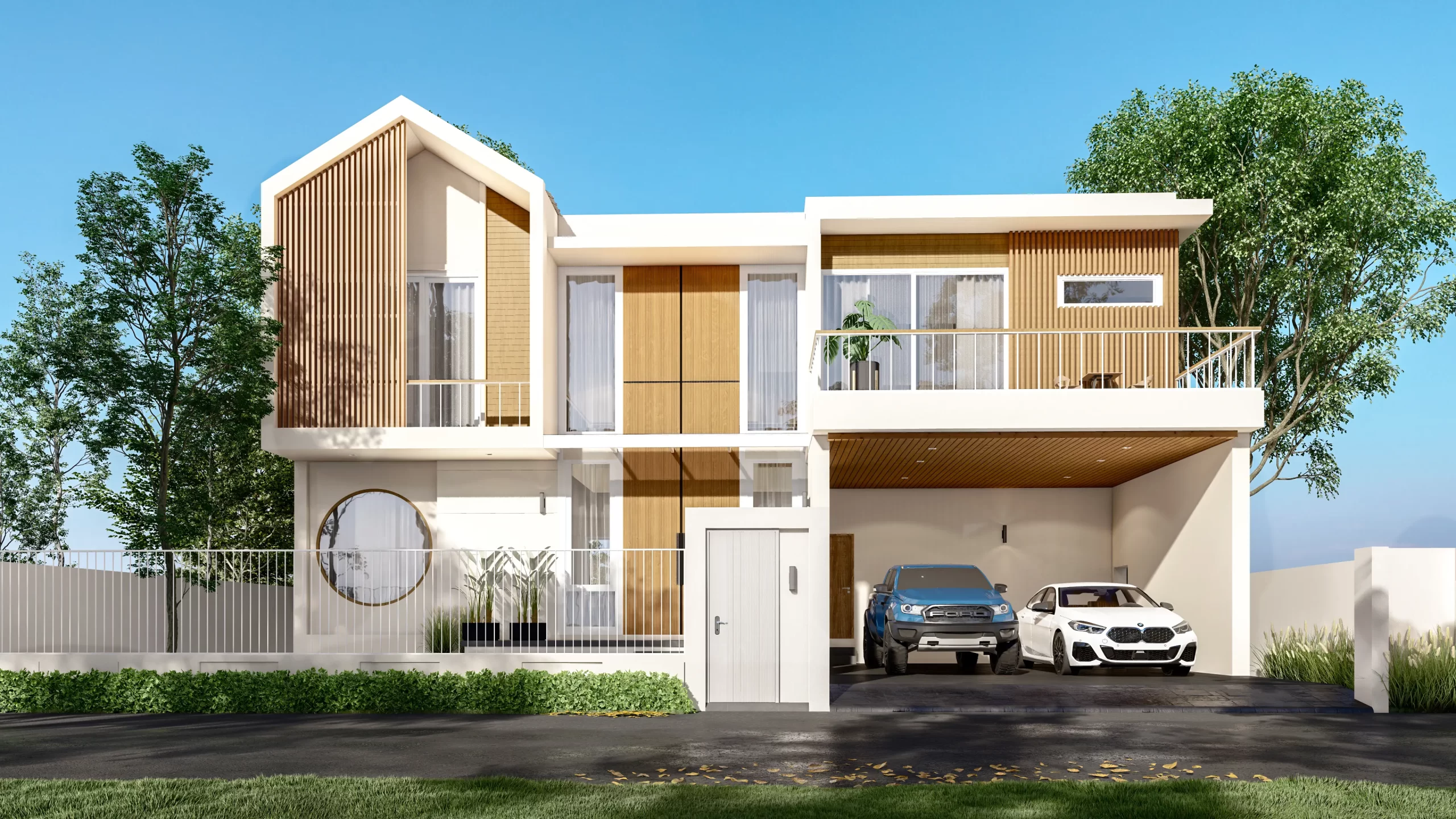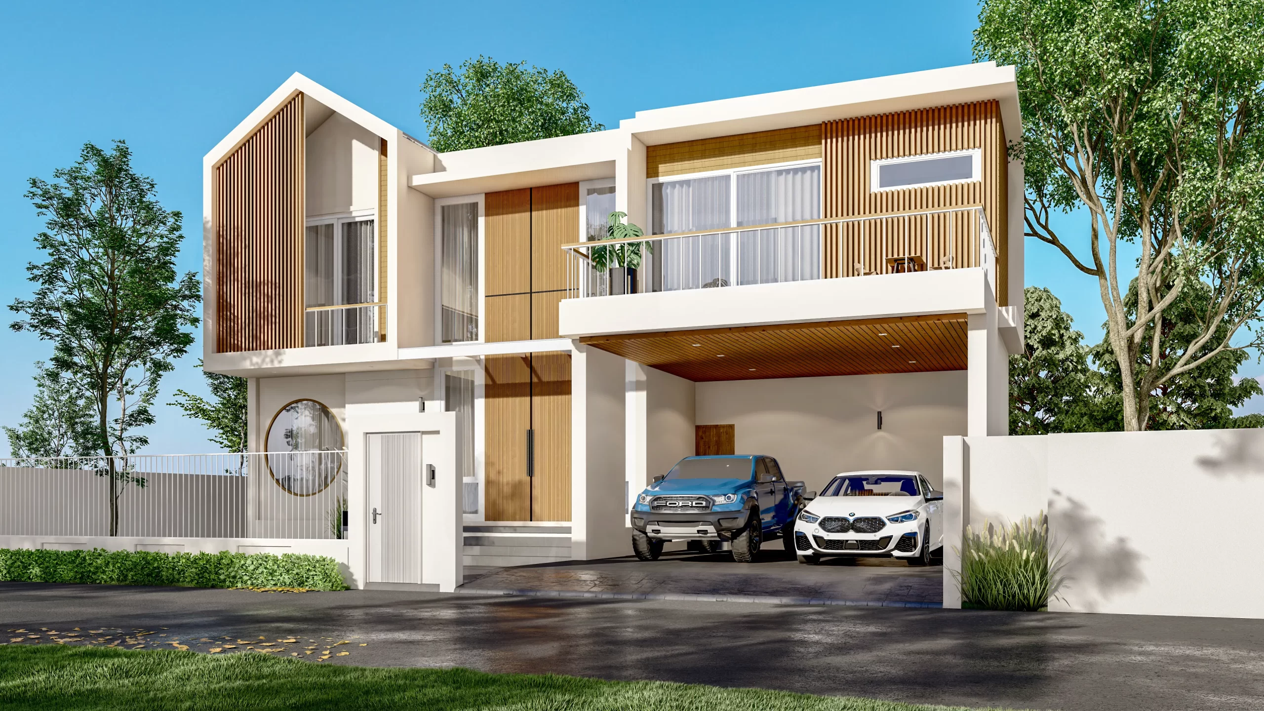 บ้าน Modern Contemporary จ.เชียงใหม่ การผสมผสานความเรียบง่ายแบบตะวันออกเข้ากับความหรูหราทันสมัย ห้องนั่งเล่นแบบ Double Volume ที่เปิดฝ้าเพดานสูงเชื่อมต่อชั้น 1 และชั้น 2 ช่วยให้บ้านดูโปร่งโล่ง อากาศถ่ายเทได้ดี และให้ความรู้สึกโอ่อ่าเหมือนโรงแรมระดับ 5 ดาว ตกแต่งผนังสูงด้วยงานไม้เพิ่มความหรูหราและอบอุ่นในคราวเดียวกัน