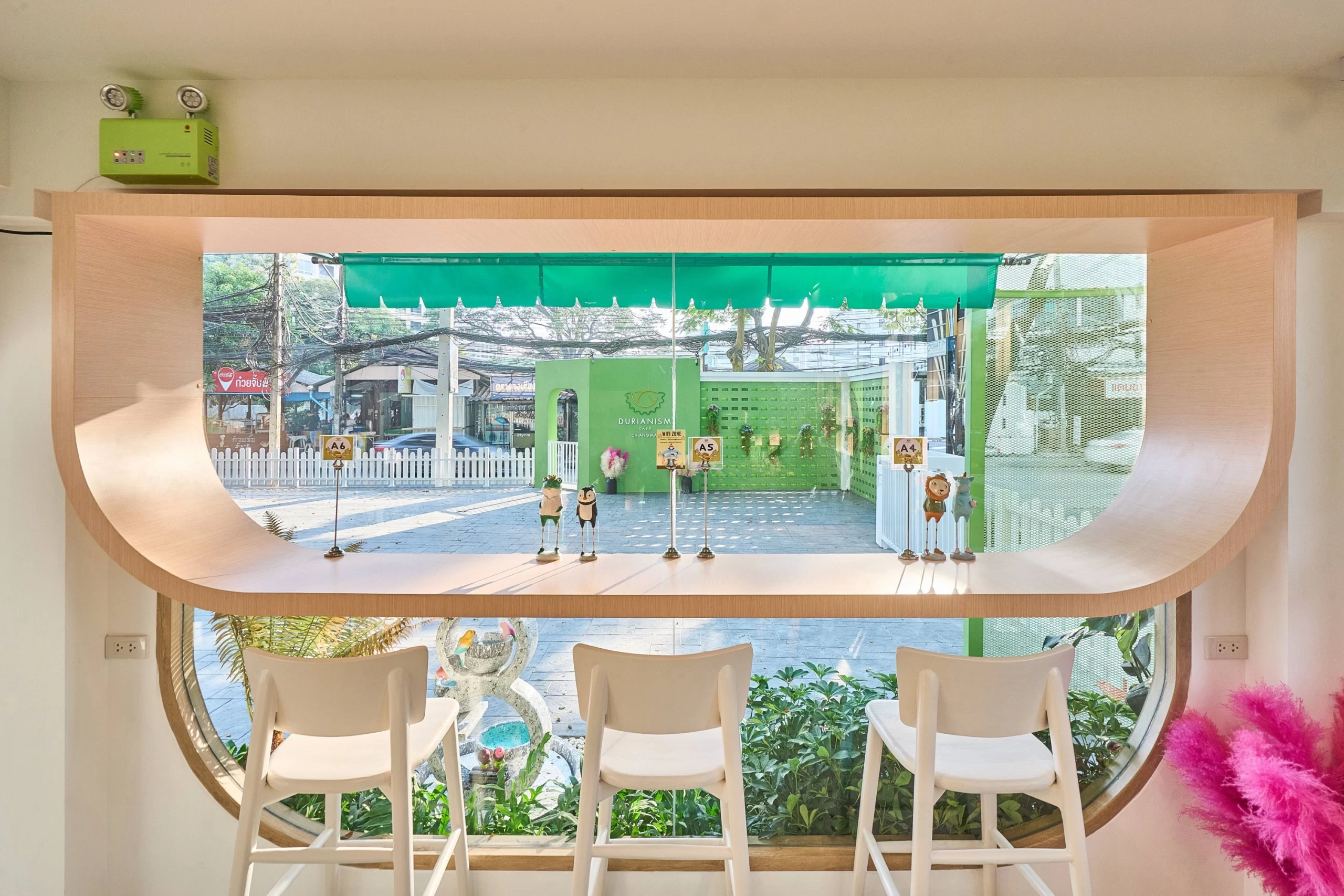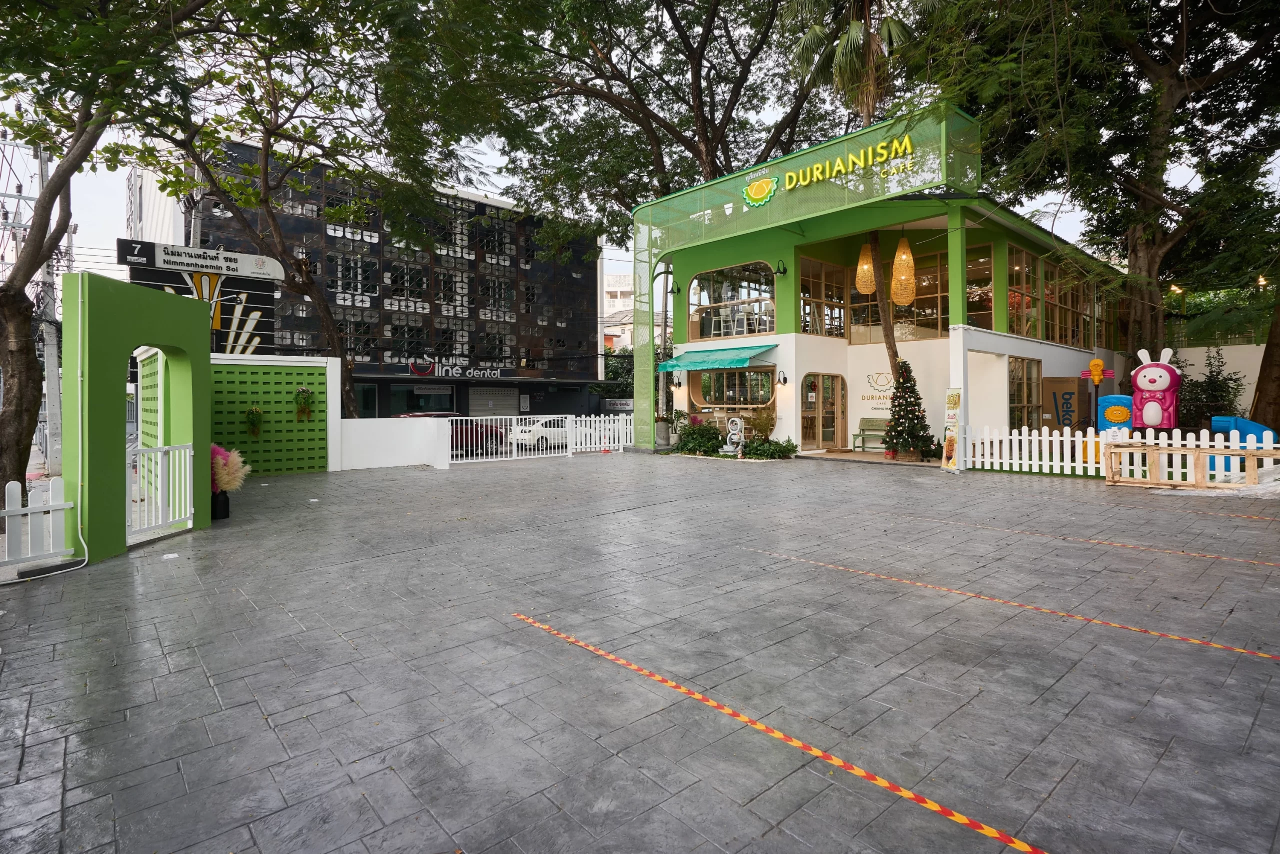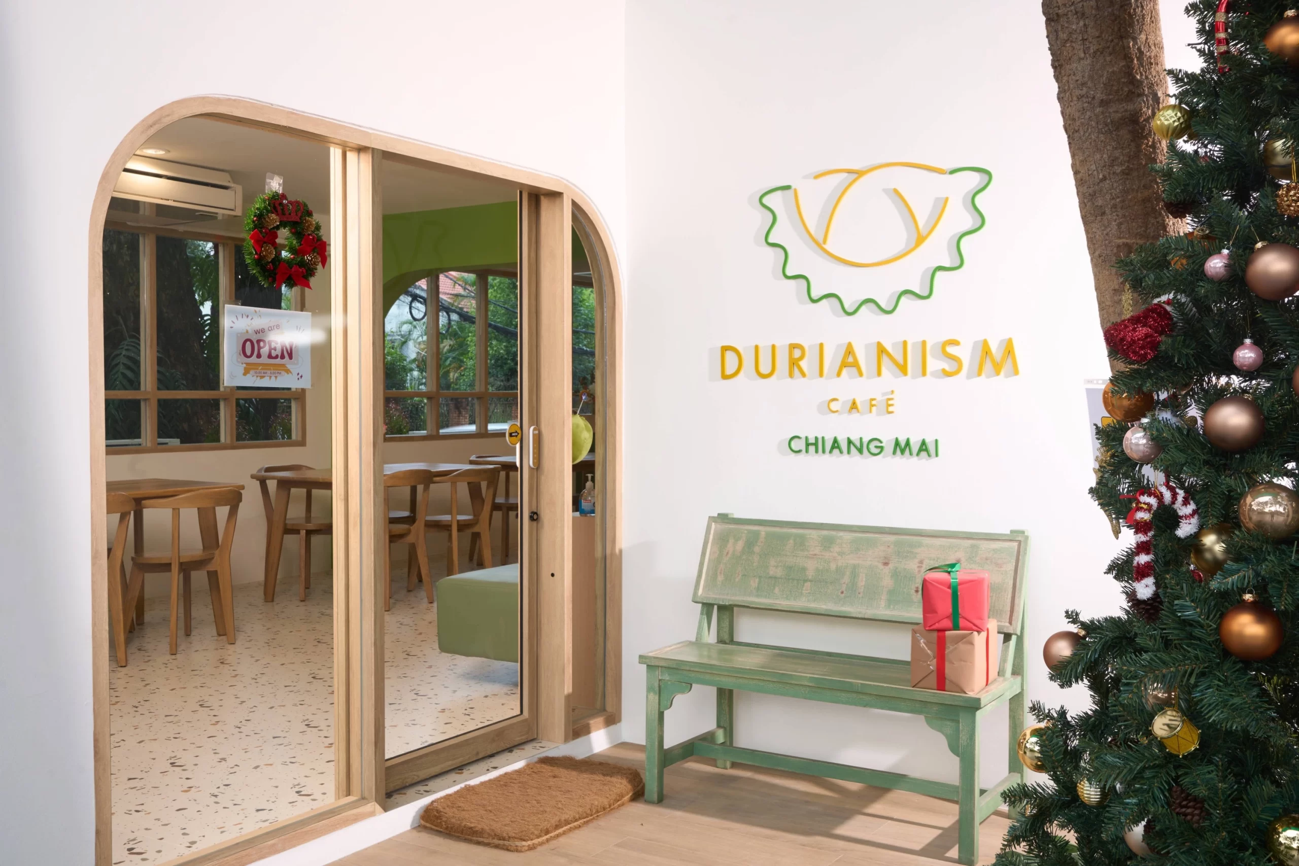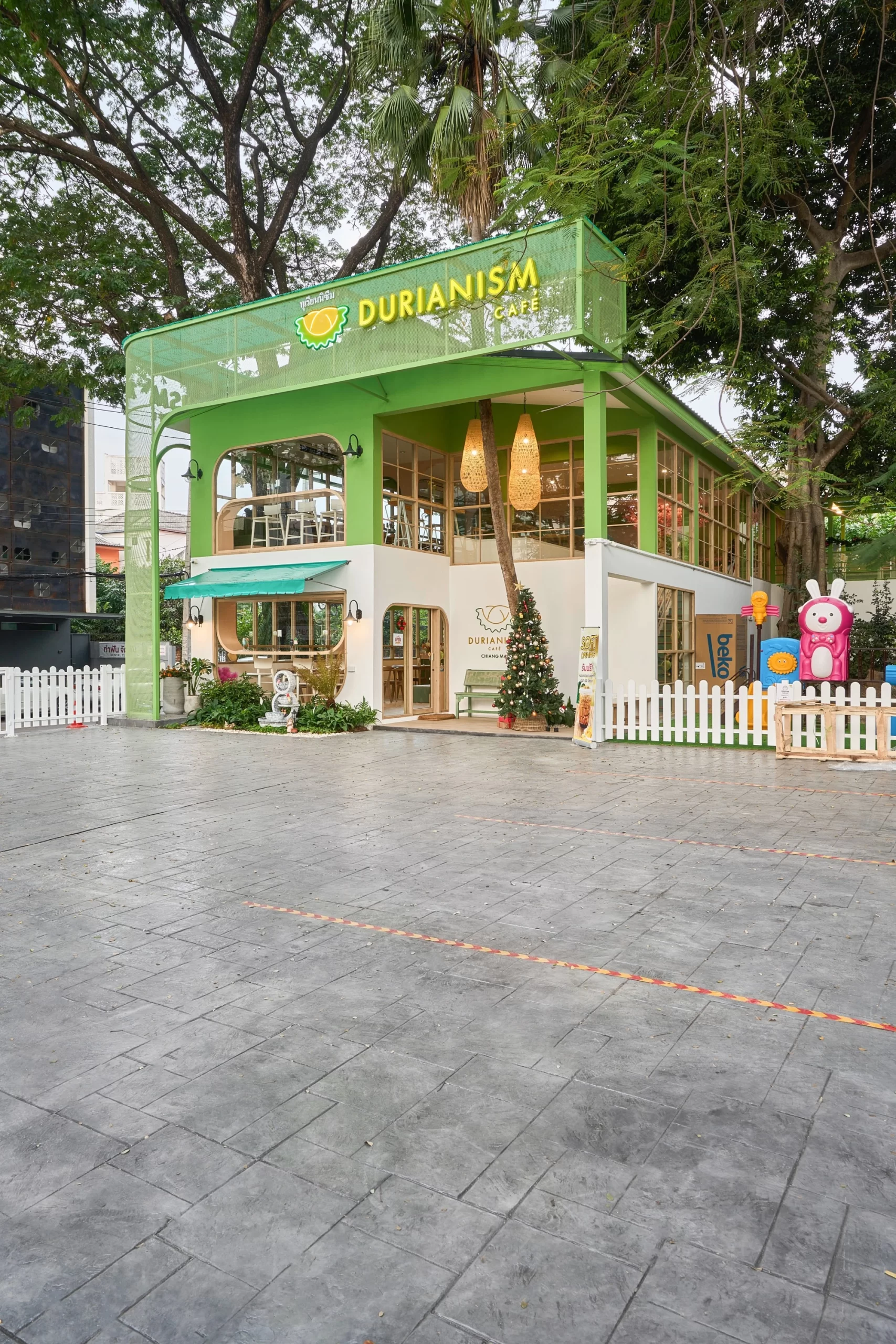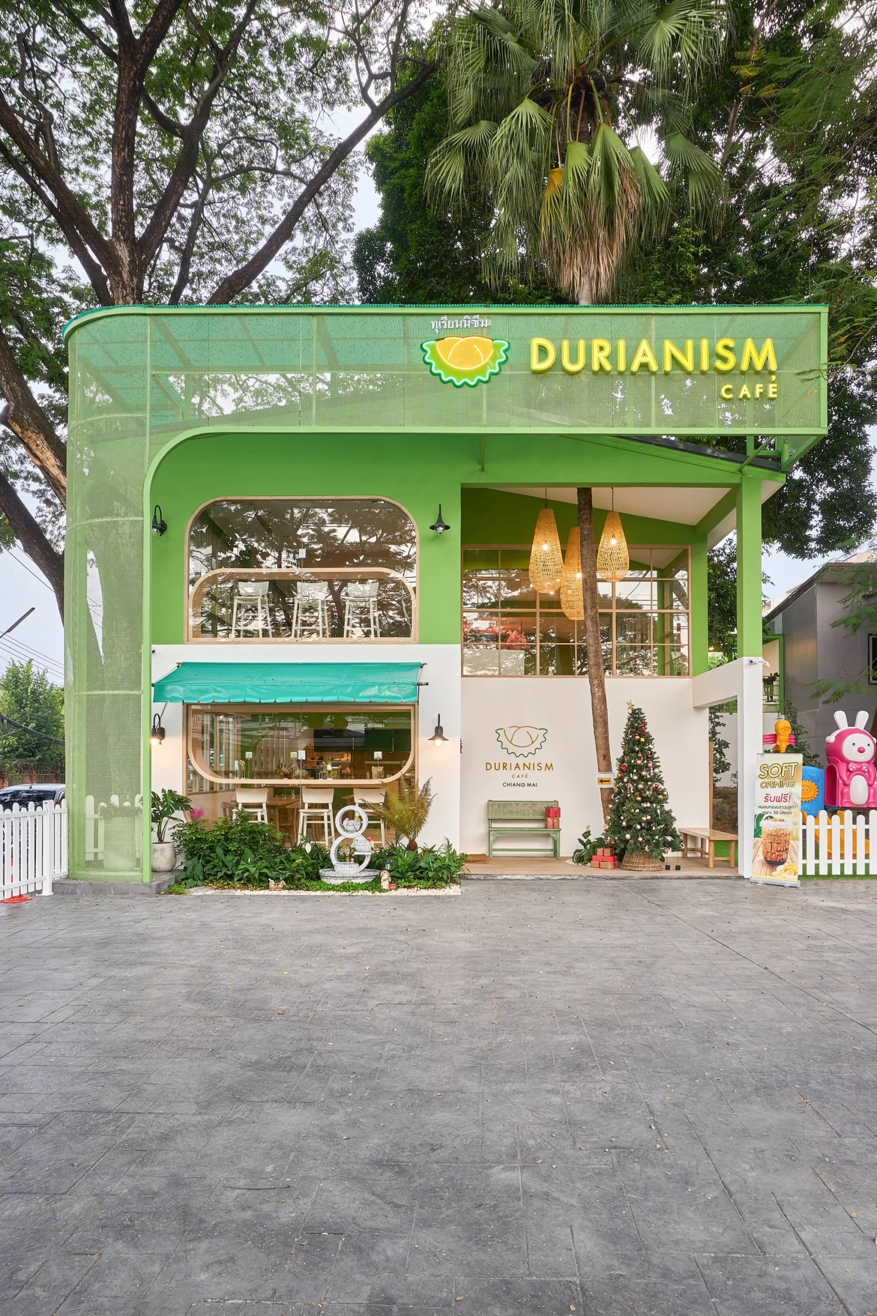 Durianism Café เชียงใหม่  การออกแบบที่ดึงเอาอัตลักษณ์ของ “ราชาแห่งผลไม้” อย่าง “ทุเรียน” มาใช้เป็นหัวใจหลักในการดีไซน์  ผสมผสานกับสไตล์ Modern Minimal ที่ดูอบอุ่นและเป็นกันเอง   ถือเป็นการทำการทำการตลาดผ่านสถาปัตยกรรมที่ชัดเจนมากครับ คือมองเห็นอาคารก็รู้ทันทีว่าเป็นร้านทุเรียน โดยที่ไม่ทิ้งความสวยงามในแบบคาเฟ่สมัยใหม่  ซึ่งสามารถ่ายรูปสวยทุกมุม