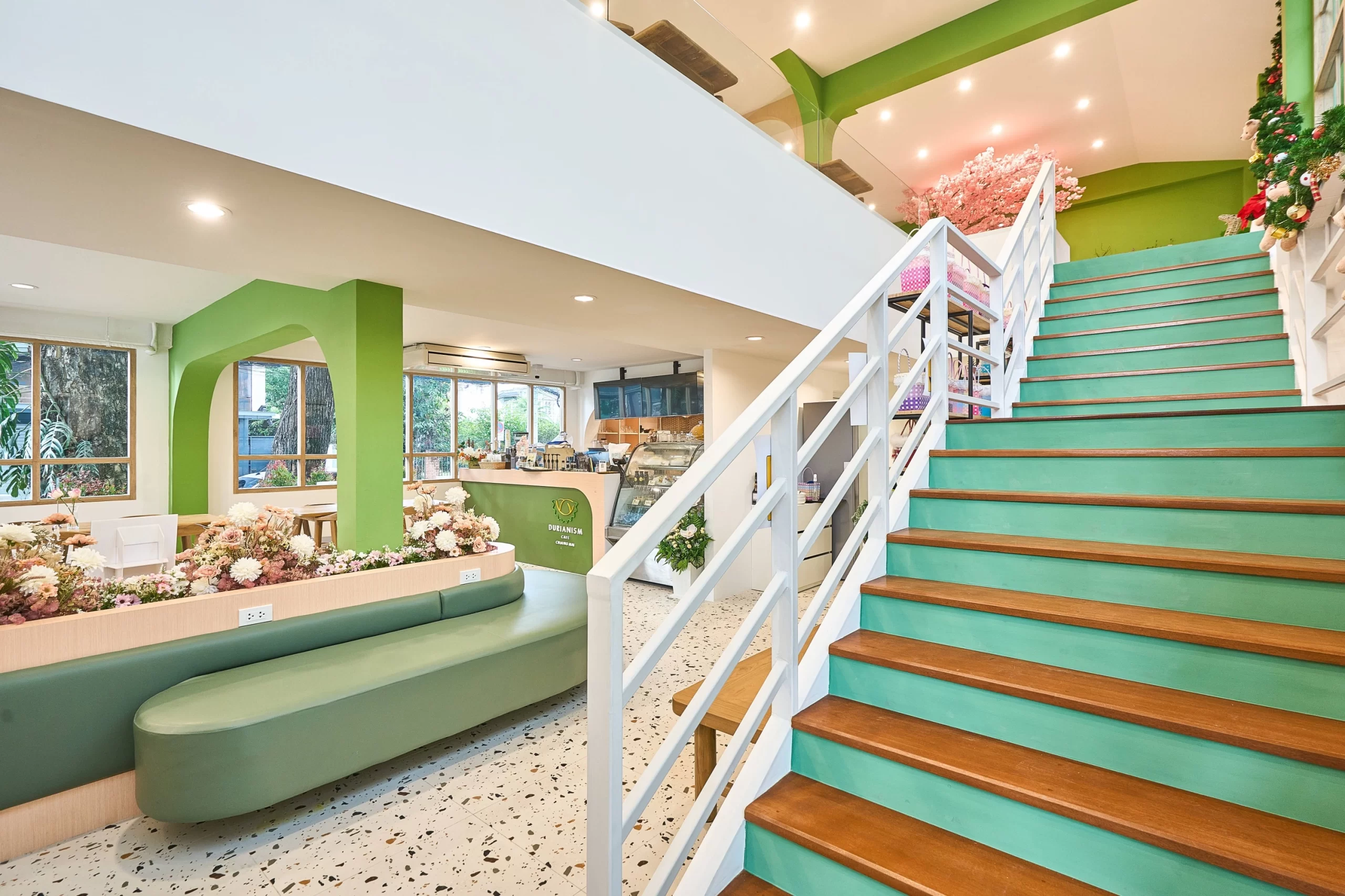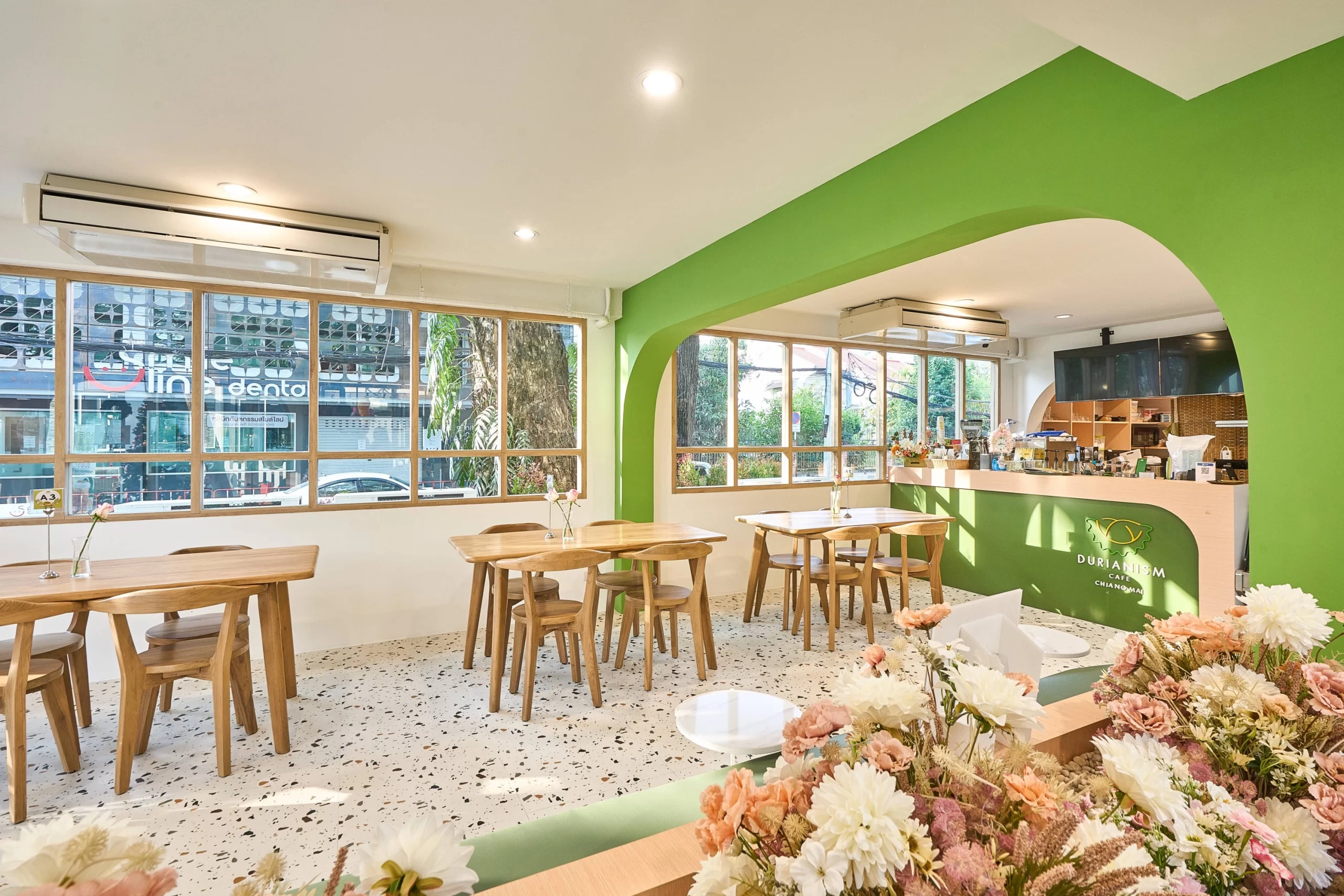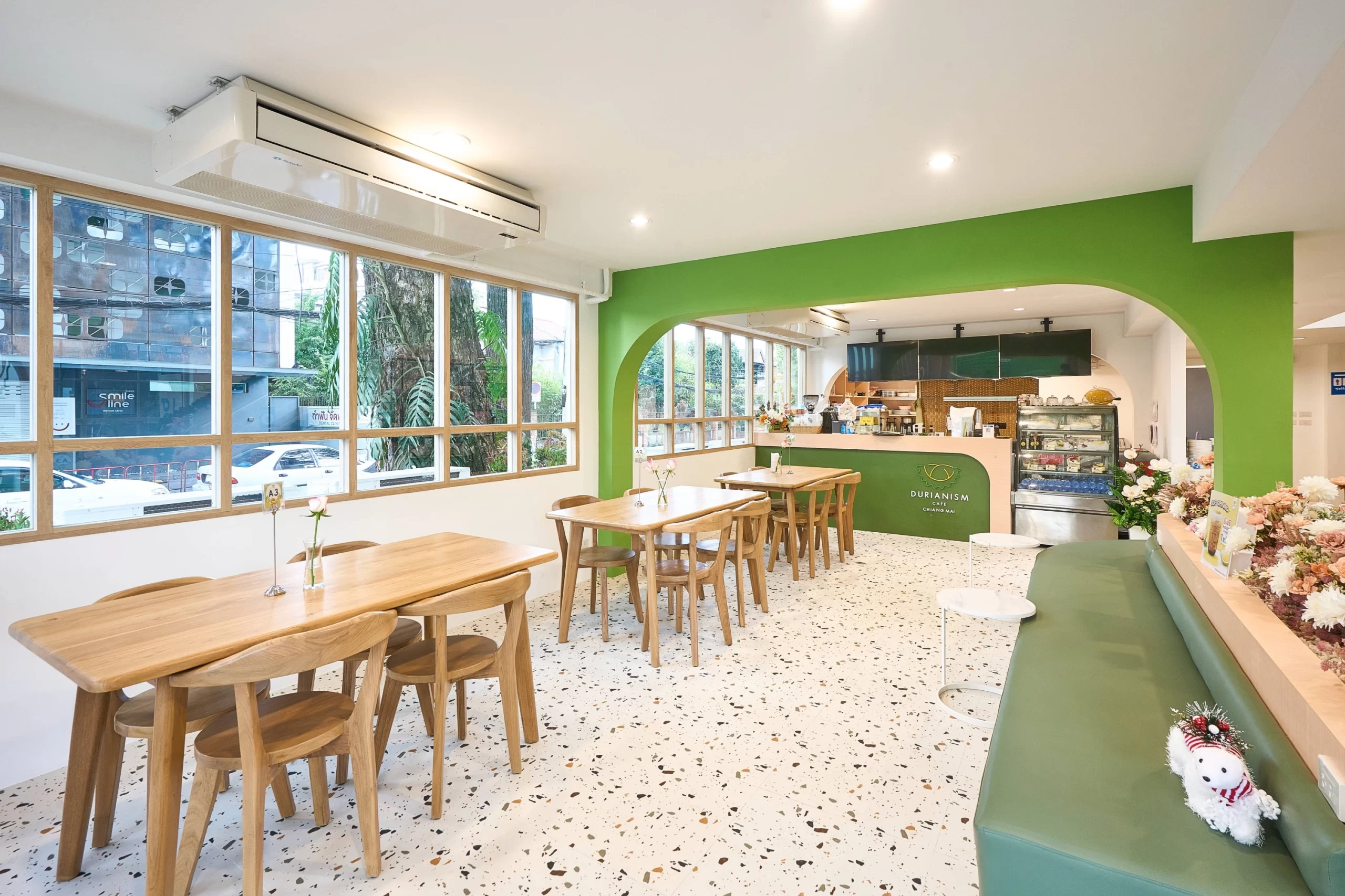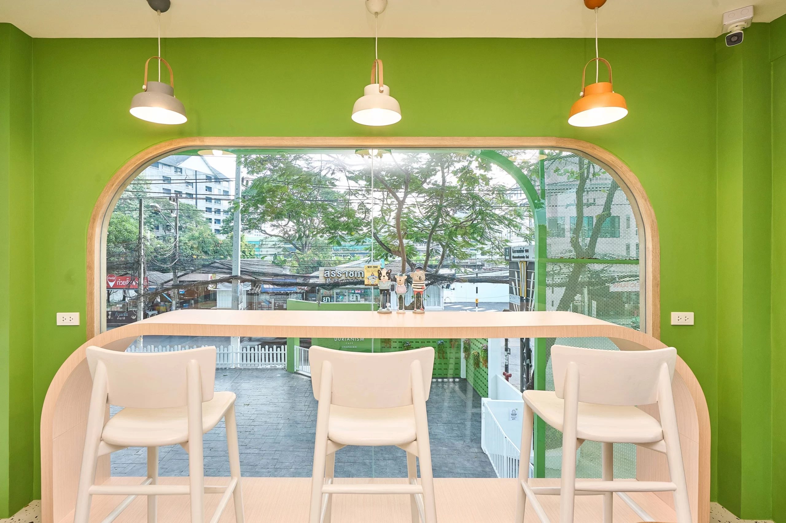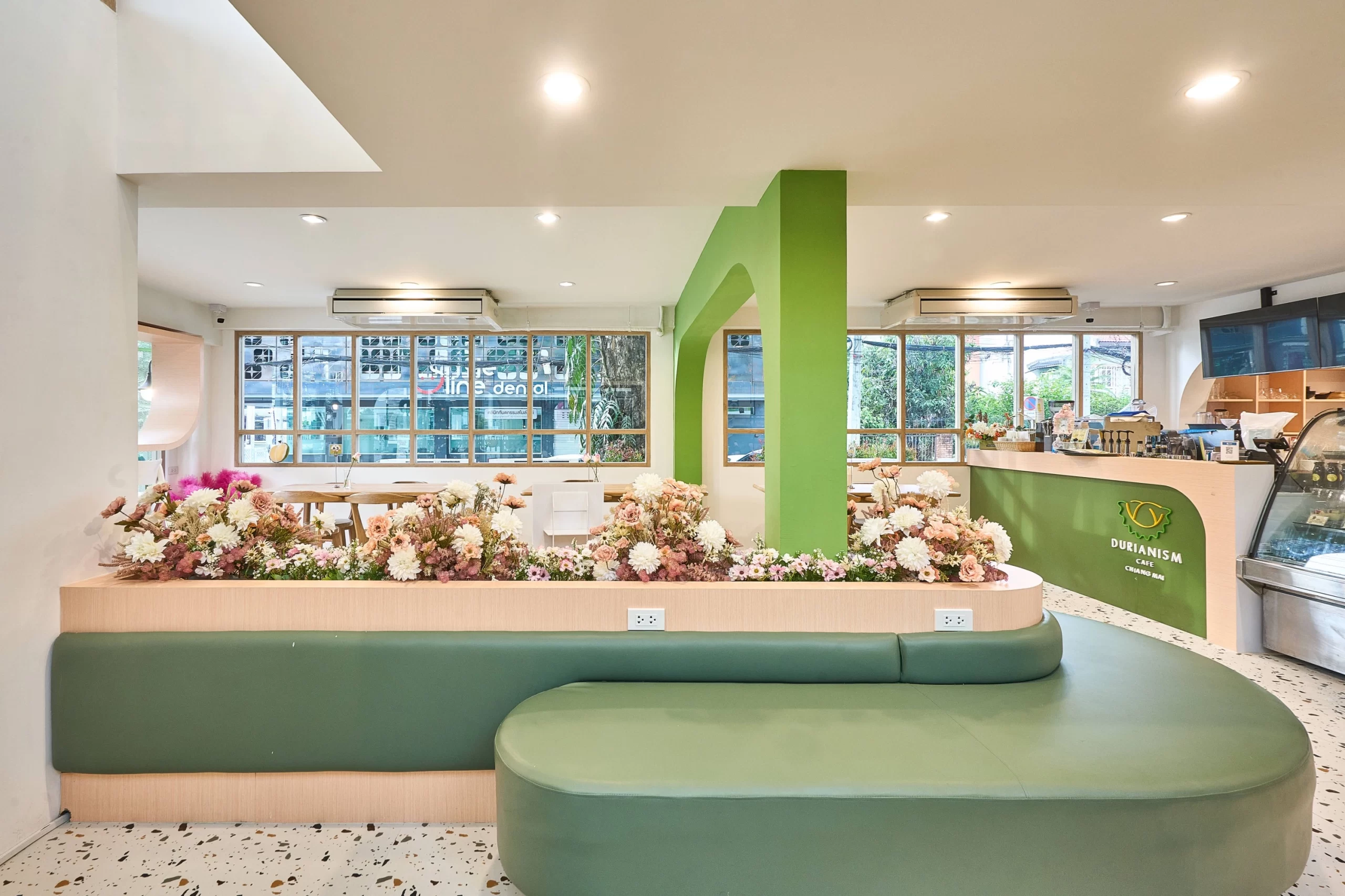 Durianism Café เชียงใหม่  การออกแบบที่ดึงเอาอัตลักษณ์ของ “ราชาแห่งผลไม้” อย่าง “ทุเรียน” มาใช้เป็นหัวใจหลักในการดีไซน์  ผสมผสานกับสไตล์ Modern Minimal ที่ดูอบอุ่นและเป็นกันเอง   ถือเป็นการทำการทำการตลาดผ่านสถาปัตยกรรมที่ชัดเจนมากครับ คือมองเห็นอาคารก็รู้ทันทีว่าเป็นร้านทุเรียน โดยที่ไม่ทิ้งความสวยงามในแบบคาเฟ่สมัยใหม่  ซึ่งสามารถ่ายรูปสวยทุกมุม
